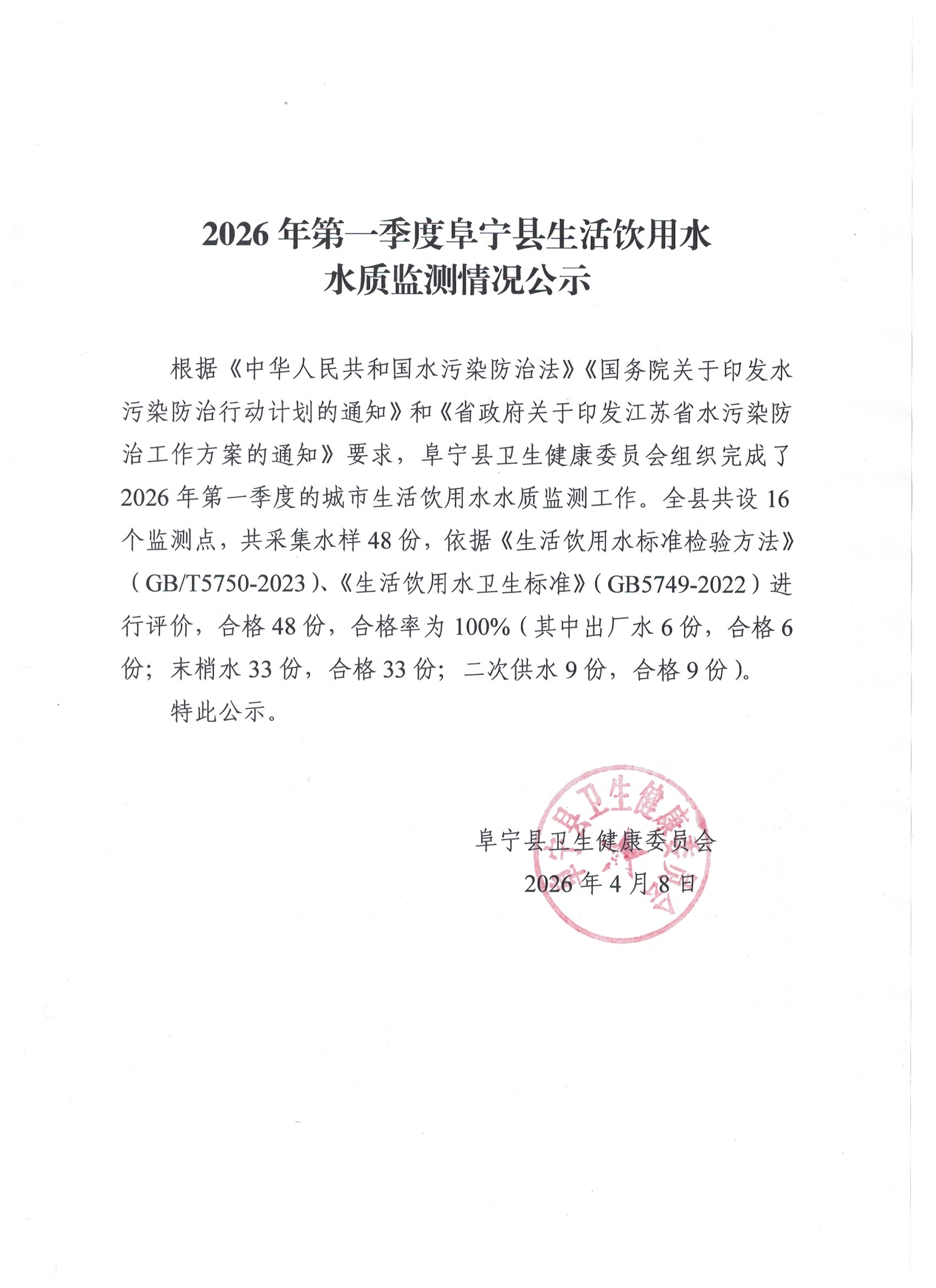 2026年第一季度阜宁县生活饮用水